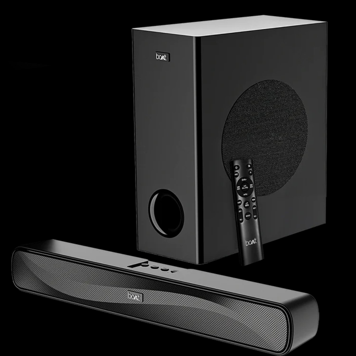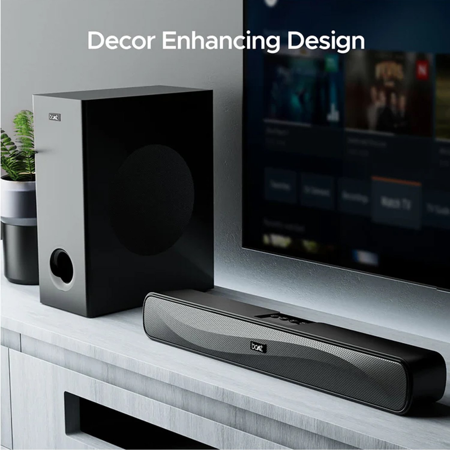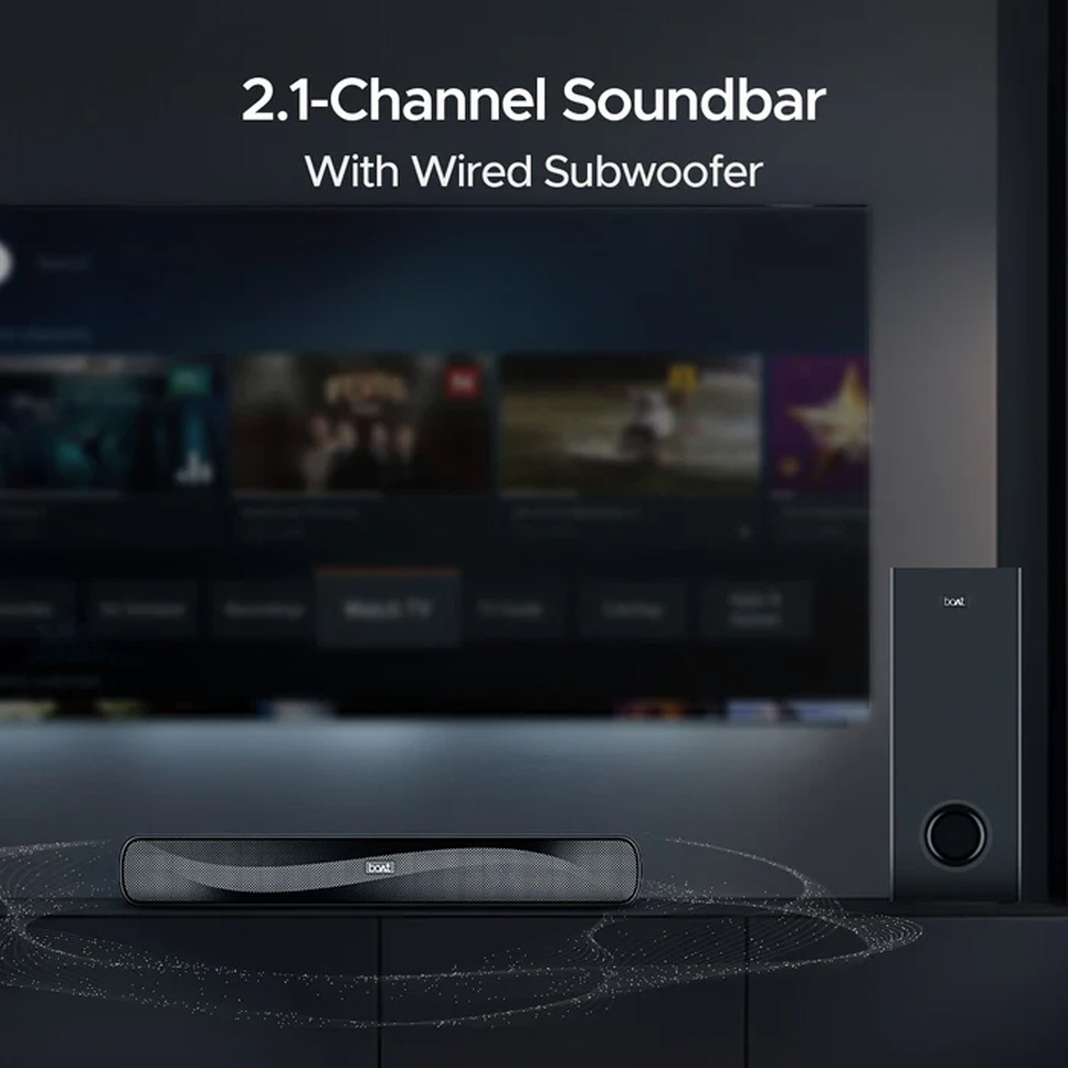 Experience powerful sound with the boAt Aavante Bar A1040, a sleek 2.1 channel soundbar that delivers 80W RMS output with deep bass from its wired subwoofer. With Bluetooth, AUX, USB, Optical, and HDMI (ARC) connectivity, it’s perfect for movies, music, and more. Stylish, versatile, and immersive — bring home cinematic sound today.
